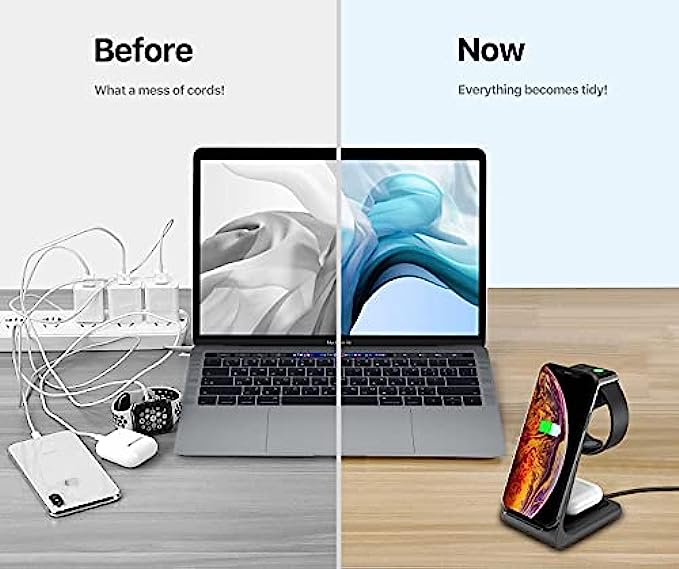 【Latest upgrade】The Qi-certified wireless charger stand with upgraded design and internal chip ensures safe and fast wireless charging. One charging device for your iPhone, iWatch, and Airpods. Suitable for home and office usage.(Attention: Only supports earpods with wireless charging cases)