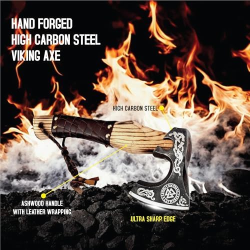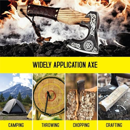 Viking Axe Ashwood Handle Handmade Carbon Steel Blade, Outdoor Camping Hunting, Norse Hatchets Axes, with Leather Wrapped Handle & Leather Sheath Wood Splitting Axes