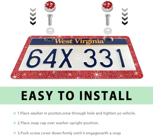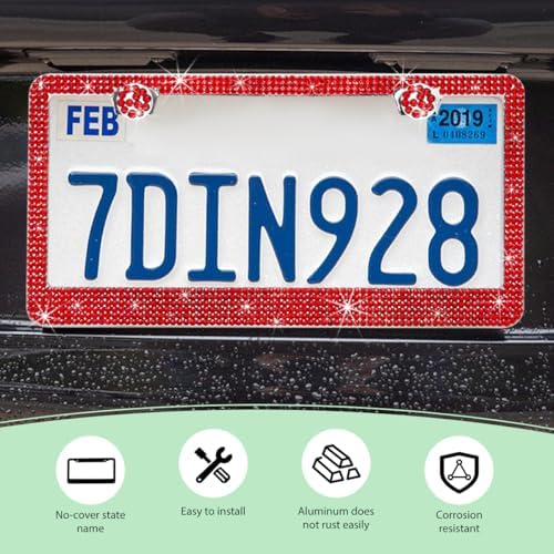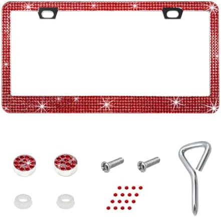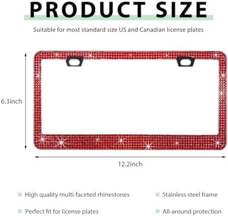 Bling License Plate Frame, Sparkly Bedazzled Auto Tag Holder with Mounting Kit, Handcrafted Crystal Stainless Steel Licence Plate Cover for Women Girls, Car Accessories (Red)