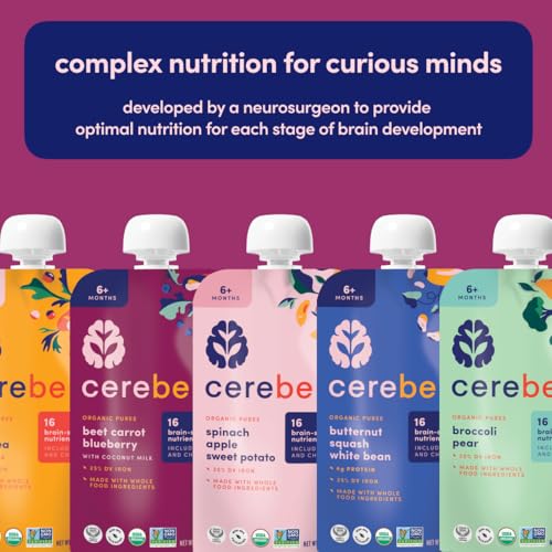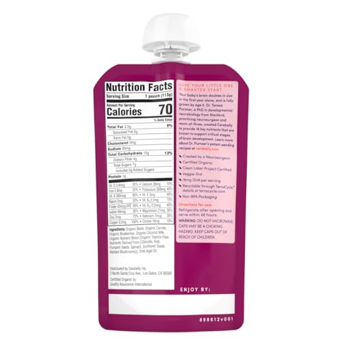 Sponsored Ad - Cerebelly Organic Baby Food Pouches, Beet Carrot & Blueberry Purees, 16 Nutrients, No Added Sugar, Fiber & Non-GMO, 4oz, 6 Pack