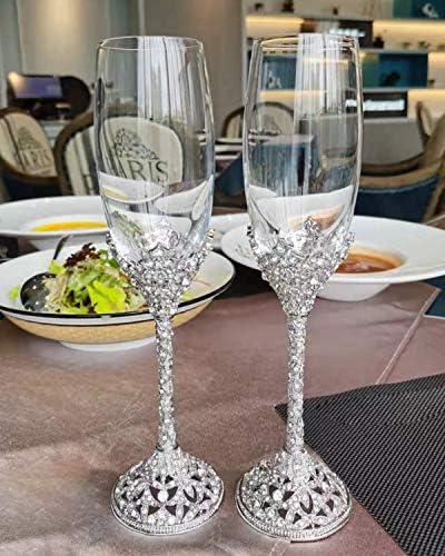 Champagne Flutes - Crystal Glass Metal Base With Crystal Stones, Set of 2 Toasting Flute Pair, Wedding Anniversary Party Birthday Banquets and Gifts for Bride and Groom(Silver)