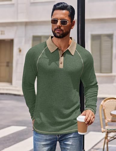 Mens Long Sleeve Polo Shirts Casual Button Collared Shirts Raglan Golf T Shirt