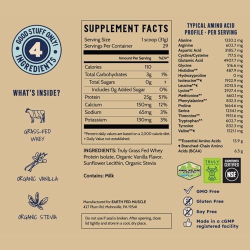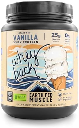 Earth Fed Muscle Whey Back Irish Grass Fed Whey Protein Isolate - NSF-Certified. No Artificial Ingredients, Soy Free, Gluten Free, Non-GMO and Hormone Free (2 Pound, 29 Servings, Vanilla)