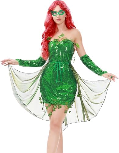 Funna Poison Costume Women Ivy Halloween Outfit 4 Piece with Eye Mask Gloves Cape