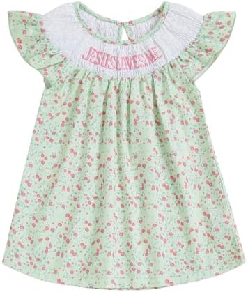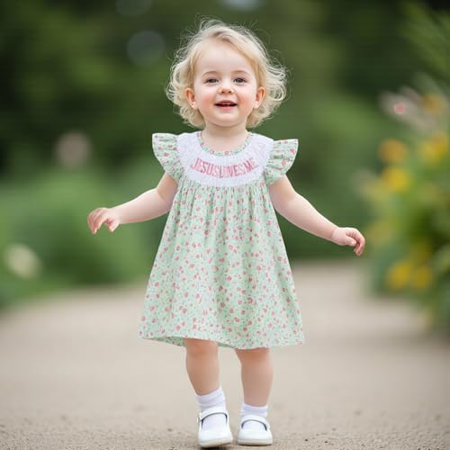 KMBANGI Toddler Baby Girl Christian Outfit Jesus Loves Me Dress Ruffle Sleeveless Smocked Dresses Baptism Outfit Princess