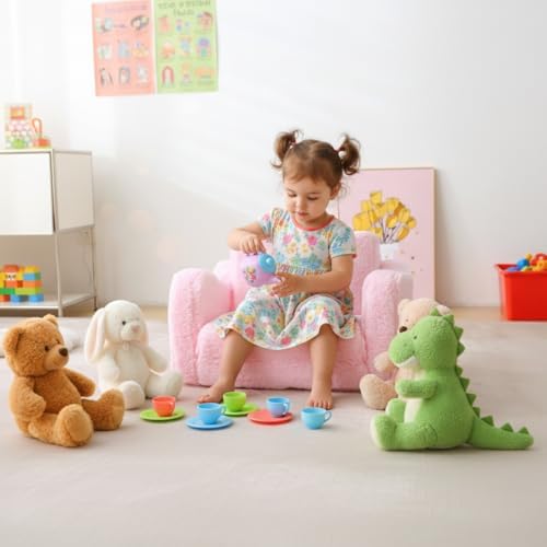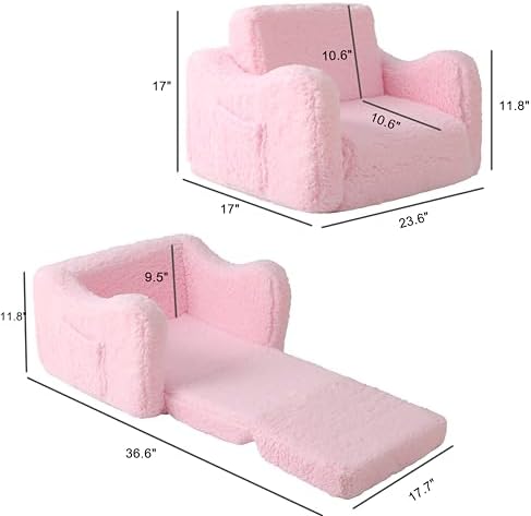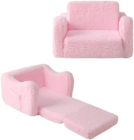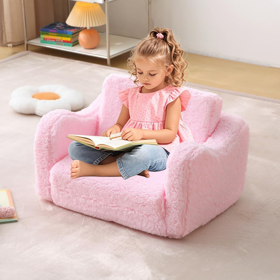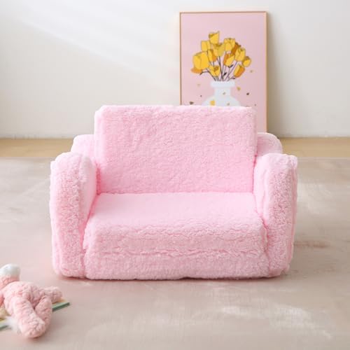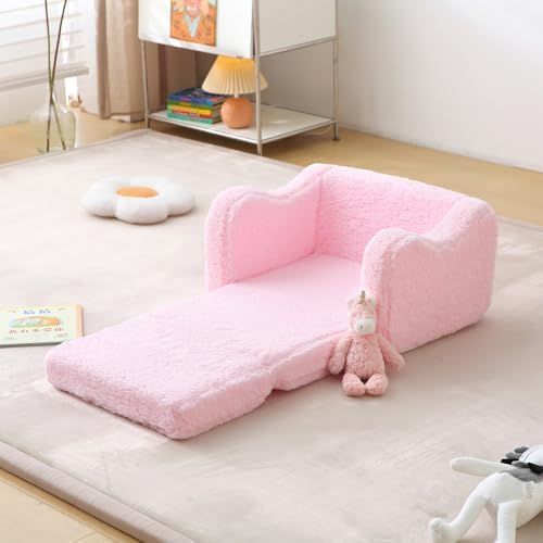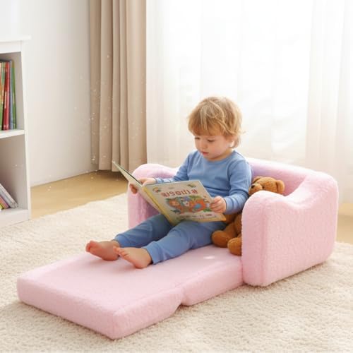 Kids Sofa for Toddler 1-3 Years, 2-in-1 Convertible Recliner & Lounger, Soft Sherpa Baby Couch for Girl and Boy, Baby Sofa Chair Fold Out Toddler Chair (Pink)