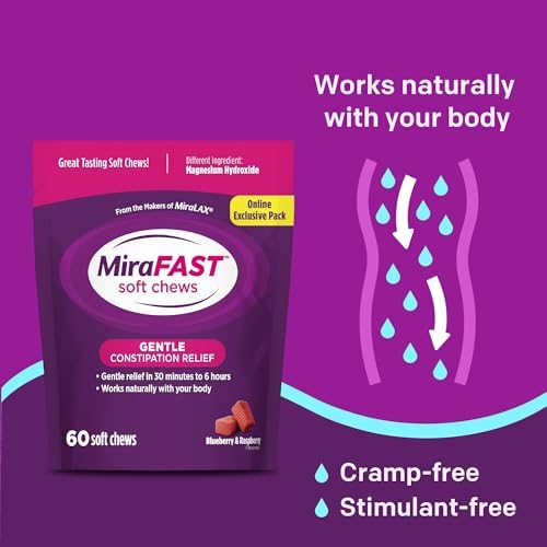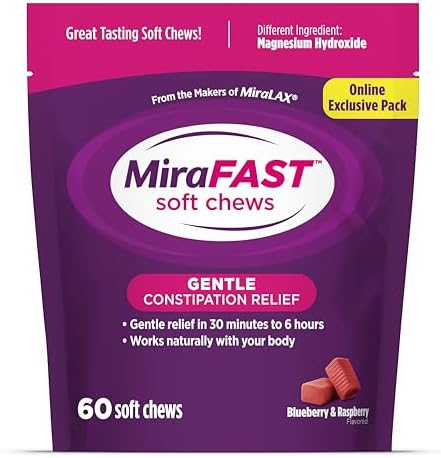 Sponsored Ad - MiraFAST Soft Chews, from The Makers of MiraLAX, Gentle Constipation Relief, Fast Acting Laxative, Stimulant Free Saline Laxative, Magnesium Hydroxide, Blueberry & Raspberry Flavor, 60c