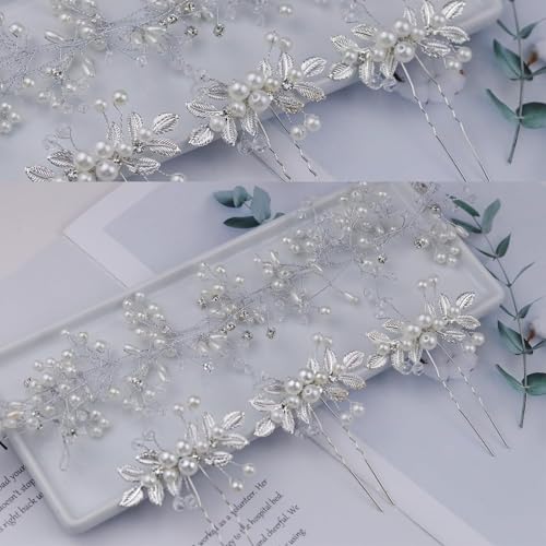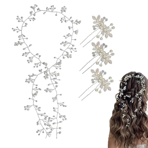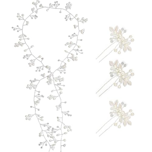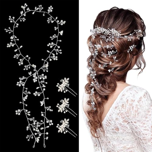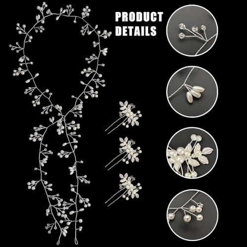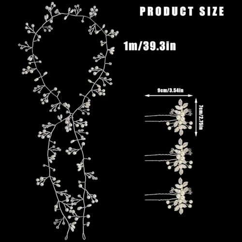 Bride Wedding Crystal Hair Vine Accessories Extra Long Pearl and Beads Bridal Headband Head Pieces for Women Girls (Silver)