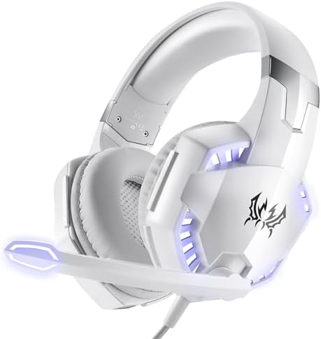 Swokely Gaming Headset, G2000 Over-Ear Gaming Headset,120-Degree Rotating Bass Noise Cancelling Mic,50mm Driver Unit,Skin-Friendly Breathable Over Ear Headphones with LED Lights for PC, Gamer - White