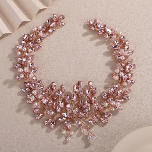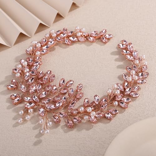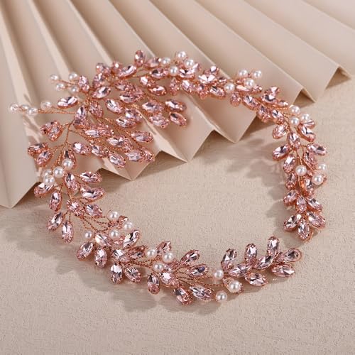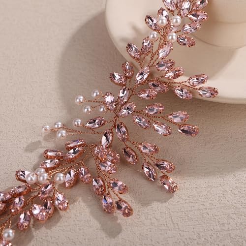 Teyglen Crystal Bride Wedding Hair Vine Bridal Pink Rhinestone Headband Sparkly Crystal Headpiece Wedding Hair Accessories for Women Bridesmaid Party Prom(Pink)