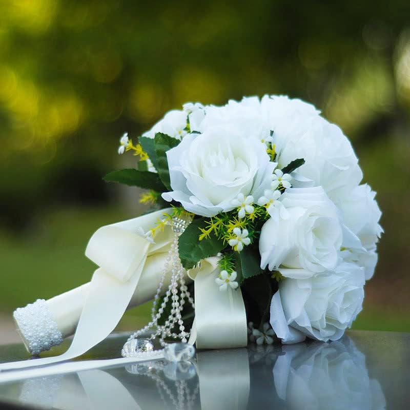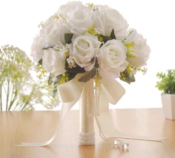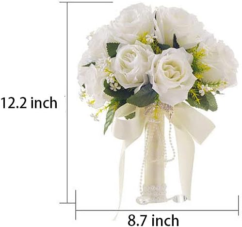 Wowagoga 12 Inch Wedding Bouquet with Pearl Crystals Ribbons,Artificial Rose Flower for Bride Bridesmaids Artificial Fake Flowers Fake Flowers Toss Bouquet for Wedding Party Church(White)